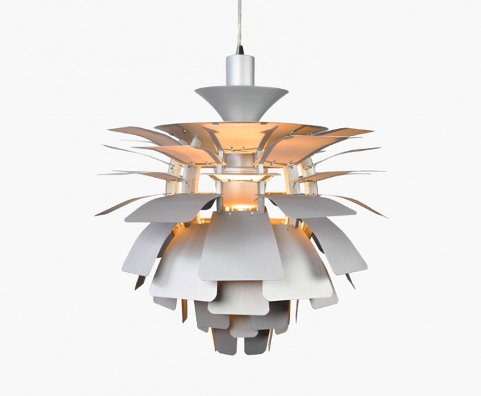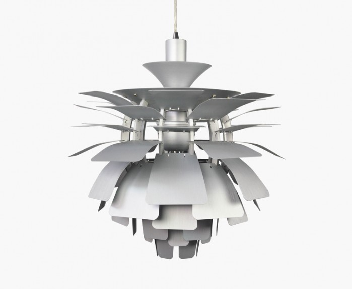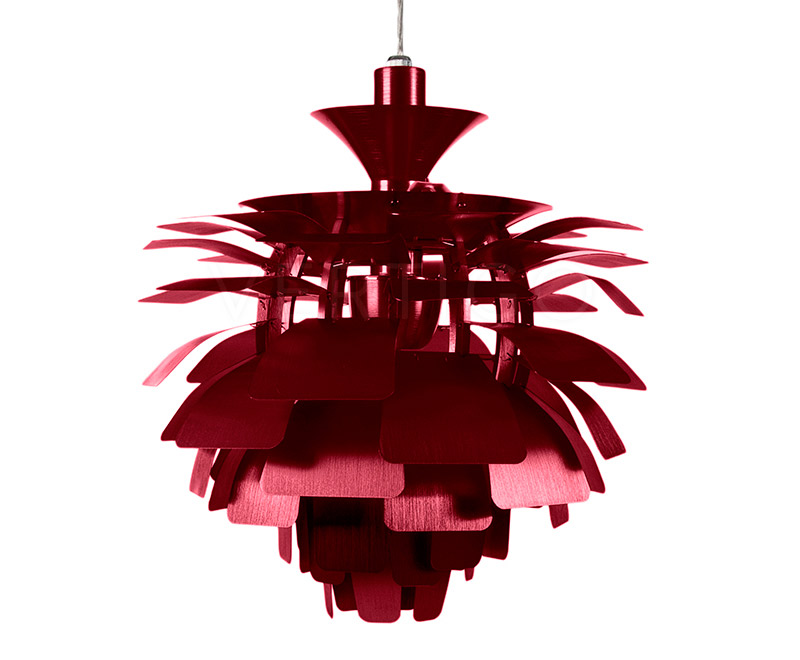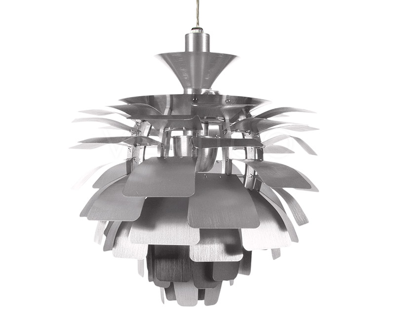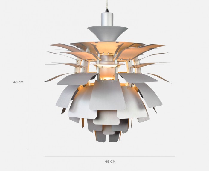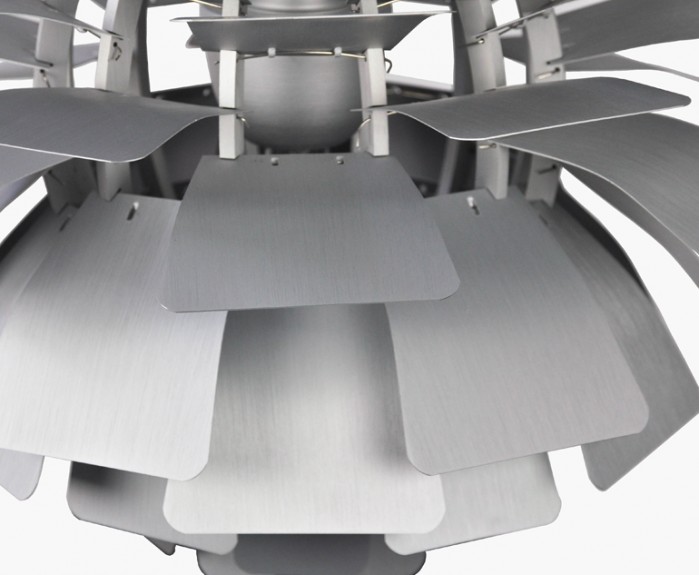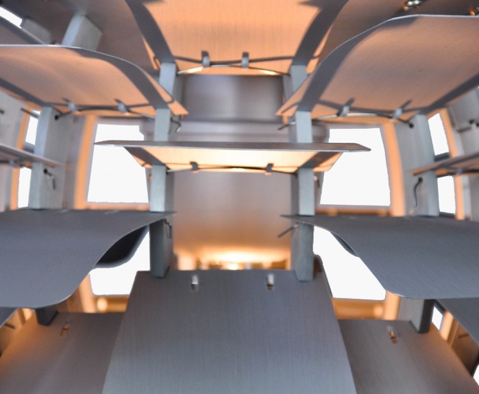 La suspension est construite avec des feuilles d'aluminium brossé découpé au laser et un cadre en aluminium brossé suspendu avec des fils en acier inoxydable.